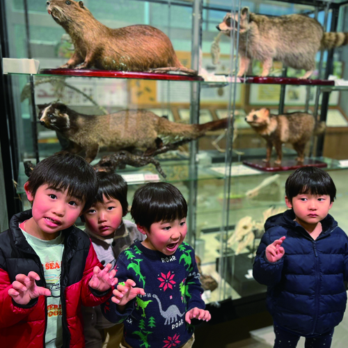 キツネやイノシシ、カブトムシなど動物の剥製や標本、すっぽんやザリガニ、アユなど水辺の生物を観察しました。いろいろな生き物を目の前でじっくり学ぶことができました。 自然博物館のあとは、近くの公園で身体を動かして楽しみました。